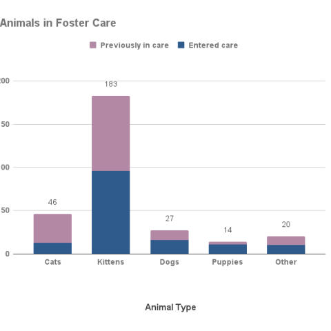 The majority of animals in foster care were kittens, cats, dogs, rabbits, and puppies. Many animals entered and left foster care over the course of the month, so the total number does not represent the maximum number of animals in care at one time.