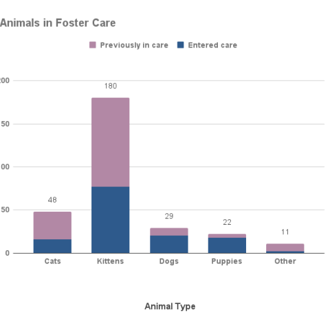The majority of animals in foster care were kittens, cats, dogs, and puppies. Many animals entered and left foster care over the course of the month, so the total number does not represent the maximum number of animals in care at one time.
