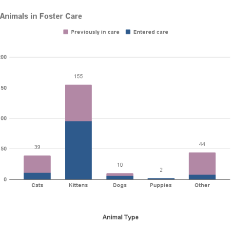 In June 2022, the majority of animals in foster care were kittens, adult cats, dogs, and rabbits. Many animals entered and left foster care over the course of the month, so the total number does not represent the maximum number of animals in care at one time.
