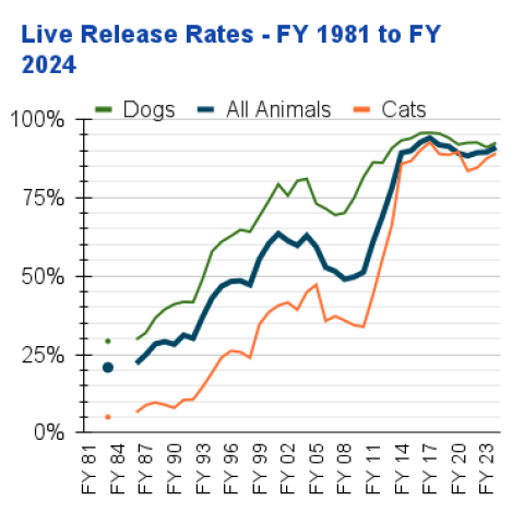 The current animal shelter was built 50 years ago, when the County’s population was just 562,640. But as the County grew to 815,428 individuals –– a nearly 45% increase— the community’s needs outstripped the shelter’s capacity. Animal sheltering practices have also changed significantly since the 1970s. While the number of animals the shelter receives each year has actually decreased, their standard of care and individual length of stay has steadily increased. The shelter has gone from a live release rate of 20% in the early 1980s to 90% today. Recent increases in animal intake since 2020 — particularly for large dogs have also strained the shelter’s capacity during peak seasons. Overall, the current shelter space is inadequate to meet current animal care standards.
