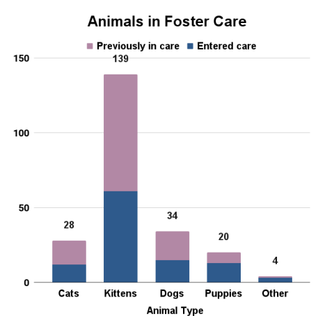 The majority of animals in foster care were kittens, cats, puppies, and dogs. Many animals entered and left foster care over the course of the month, so the total number represents the cumulative total, and not the maximum number of animals in care at one time. Thank you to 106 foster volunteers for your lifesaving service.