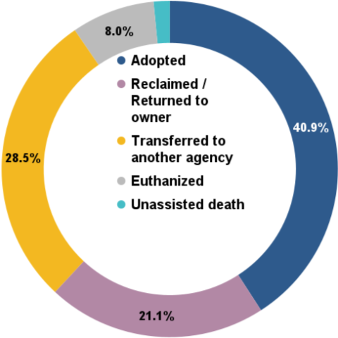MCAS accepted stray dogs, sick, injured or at-risk adult cats and kittens from the public. Officers also picked up stray or lost animals. Owner-surrendered animals were accepted on a case by case basis, depending on urgent circumstances; adoption returns are also included in the total. Other intakes represent animals placed into emergency custody by Animal Services officers, injured wildlife, or shelter offspring.
