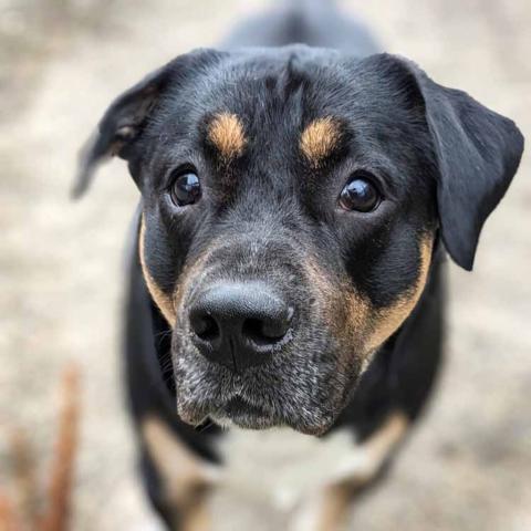 Hey there! My name is Gunner and I am an adult male Rottie mix. Since I am blind, when going to pet me please do your best not to make sudden movements that may startle me. I am known to be scared of loud noises, but once I know who is coming up to me I will be your best friend! I might need a little more guidance on walks than most dogs, but that's just because I'm a special boy. When I'm excited, I get super wiggly and jumpy because I can't wait to hang out with you. My new potential family should know that because I am blind and startle easy in unfamiliar settings, I will need time to get to know my surroundings when you take me home! I would probably do best in a household with no young kids, but I do get along well with other doggies. I love to go on walks, and helping me lose a few pounds wouldn't hurt! If you are seeking a silly friend to keep you company through your life and are ready for the happiness a blind dog can bring you then please come say hi :) How to Adopt