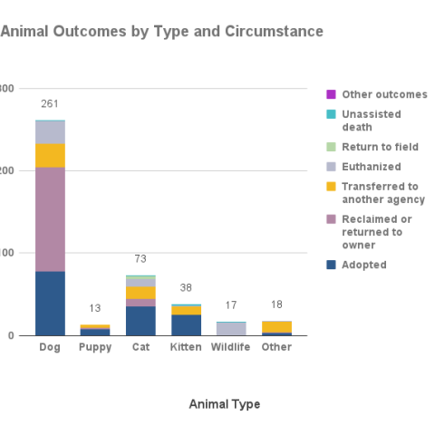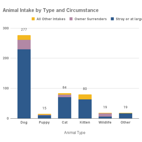 MCAS accepted stray dogs, sick or injured adult cats and kittens from the public. Officers also picked up stray or lost animals. Owner-surrendered animals were accepted on a case by case basis, depending on urgent circumstances. Other intakes commonly represent animals placed into protective custody or impounded for bite quarantine.