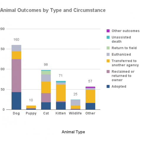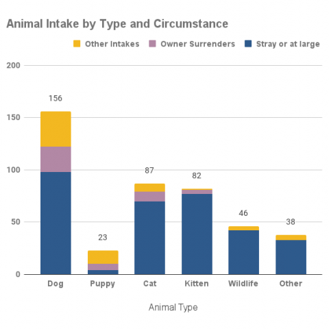 MCAS continued to accept stray pets from members of the public, and officers also picked up stray or lost animals. Owner surrendered animals were accepted on a case by case basis, depending on urgent circumstances. Other intakes most commonly represent animals placed into protective custody by Animal Services officers.