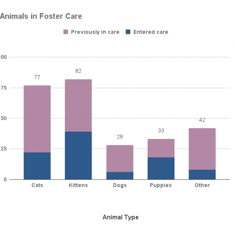 In August 2021, ninety-three (93) animals entered foster care, joining the existing one-hundred-and-sixty-nine (169) animals already in care at the beginning of the month. The majority of animals in foster care were kittens, adult cats, and rabbits. MCAS foster volunteers cared for a total of two-hundred-and-sixty-two (262) foster animals. Eighty-eight (88) of these animals left foster care for other outcomes over the course of the month, so the total number does not represent the maximum number of animals in care at one time.