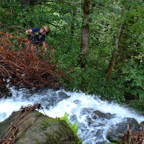 Firefighter Brett Swenson of Gresham Firehouse 75 conducts a high-angle rope technical rescue of Zanzon the dog in Beaver Creek Canyon.