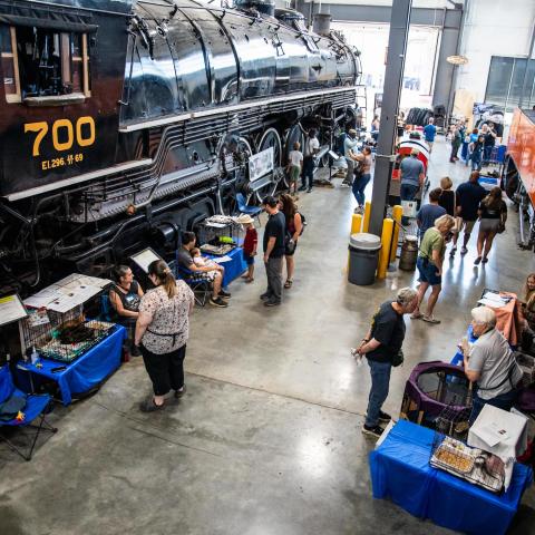Foster volunteers feature adoptable pets in the Oregon Rail Heritage Center Enginehouse
