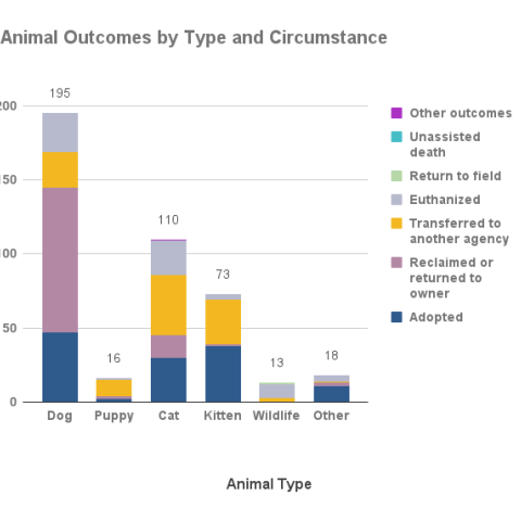 MCAS accepted stray dogs, sick or injured adult cats and kittens from the public. Officers also picked up stray or lost animals. Owner-surrendered animals were accepted on a case by case basis, depending on urgent circumstances. Other intakes commonly represent animals placed into protective custody by Animal Services officers.