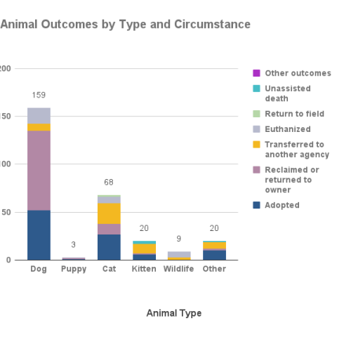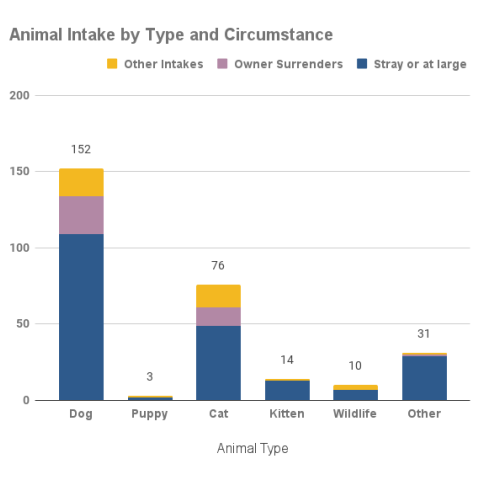 MCAS accepted stray dogs, sick or injured adult cats, kittens 6 weeks to 6 months old, and officers also picked up stray or lost animals. Owner-surrendered animals were accepted on a case by case basis, depending on urgent circumstances. Other intakes commonly represent animals placed into protective custody by Animal Services officers.