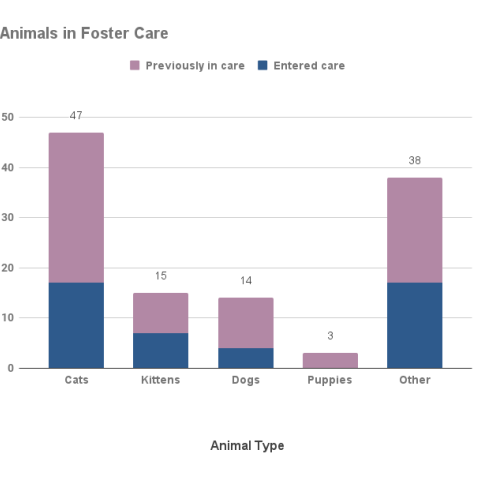 In February 2022, forty-five (45) animals entered foster care, joining the existing seventy-two (72) animals already in care at the beginning of the month. The majority of animals in foster care were adult cats and kittens. MCAS foster volunteers cared for a total of one-hundred-and-seventeen (117) foster animals. Thirty-nine (39) of these animals left foster care for other outcomes over the course of the month, so the total number does not represent the maximum number of animals in care at one time.