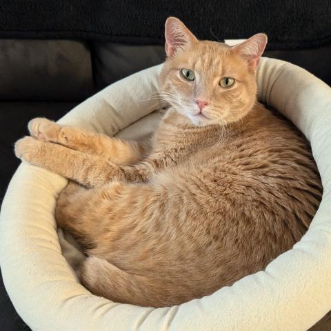 We adopted Cooper [in October 2024] and he is now fully integrated into his new life with us. His previous owners had surrendered him to the shelter and we are so thankful they did because he is a wonderful cat and a perfect addition to our family. He is sweet, playful, and affectionate. He chases and plays with our two younger cats and snuggles with our older cat. He happily runs around the house, making chirping noises and chasing cat toys. He loves to lay down and lounge next to us and be petted, constantly purring to show his happiness.