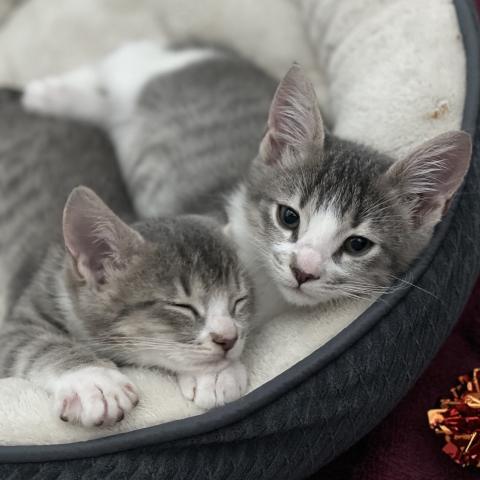 Ralph and Max are brothers who were found on the street at 5 weeks old, riddled with parasites and without their mom. By the time we adopted them a month later, they were healthy and thriving. They love to snuggle and play, and they are already big fans of our dog, who they sometimes think is their long lost mama. We are so in love with them! We could not be more grateful to their fosters and everyone at MCAS who helped us through this process.