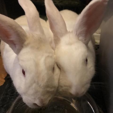 Sometimes magic strikes twice. That's the case for me, a bunny person of more than 35 years, when I have adopted from MCAS. Having done rabbit rescue for years, I preferred to adopt someone who was not likely to be chosen. I connected with a New Zealand White who had been taken to the shelter with TEN other pets when the human family was overwhelmed and couldn't handle them. He was going through a massive shed, exploding white fur everywhere, so we named him Ullr after the Norse god of snow and ice. He is PERFECT! He's a gentle, sweet lap rabbit, and will literally sit in my lap being petted for hours. In all my years with house rabbits - they are always free range in the house as a cat might be - I have never had a bunny so flawless. After he adjusted to our household, we. knew it was time to get him a companion with four feet and longer ears than the resident cat and two humans have. Whoever we adopted was going to have to meet the very high bar that Ullr has set for Rabbit Perfection.