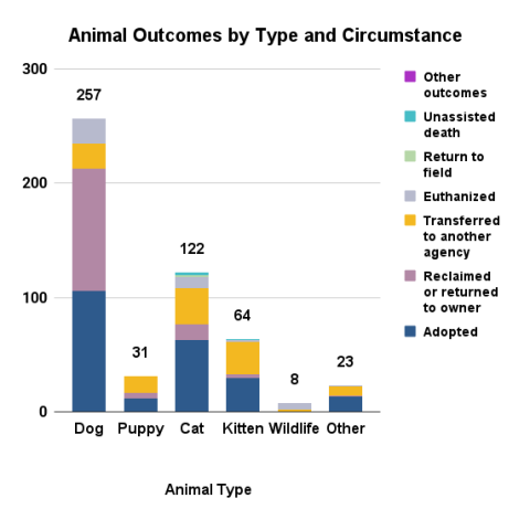 MCAS accepted stray dogs, sick, injured or at-risk adult cats and kittens from the public. Officers also picked up stray or lost animals. Owner-surrendered animals were accepted on a case by case basis, depending on urgent circumstances; adoption returns are also included in the total. Other intakes represent animals placed into emergency custody by Animal Services officers, injured wildlife, or shelter offspring.