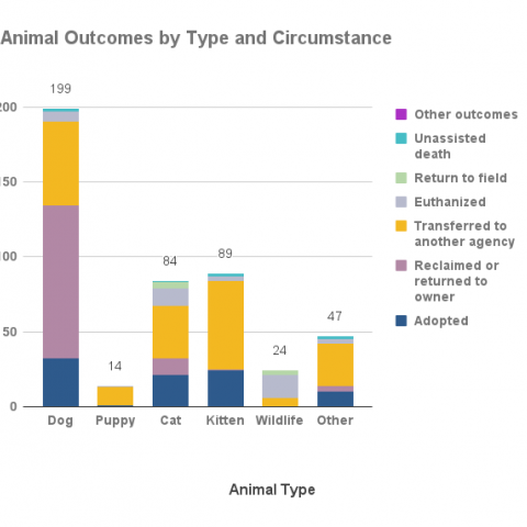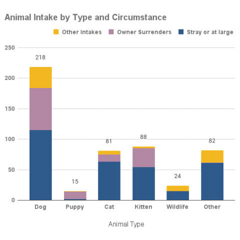 MCAS continued to accept stray pets from members of the public, and officers also picked up stray or lost animals. Owner surrendered animals were accepted on a case by case basis, depending on urgent circumstances. Other intakes most commonly represent animals placed into protective custody by Animal Services officers.