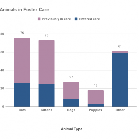 In July 2021, one-hundred-twenty-one (121) animals entered foster care, joining the existing one-hundred-and-thirty-four (134) animals already in care at the beginning of the month. The majority of animals in foster care were kittens, adult cats, and rabbits. MCAS foster volunteers cared for a total of two-hundred-and-fifty-five (255) foster animals. Ninety-eight (98) of these animals left foster care for other outcomes over the course of the month, so the total number does not represent the maximum number of animals in care at one time.