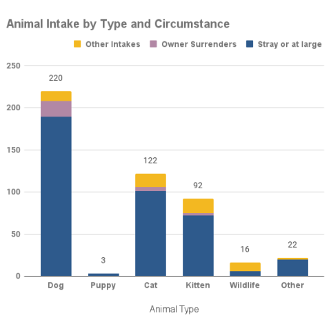 MCAS accepted stray dogs, sick or injured adult cats, kittens 6 weeks to 6 months old, and officers also picked up stray or lost animals. Owner-surrendered animals were accepted on a case by case basis, depending on urgent circumstances. Other intakes commonly represent animals placed into protective custody by Animal Services officers.