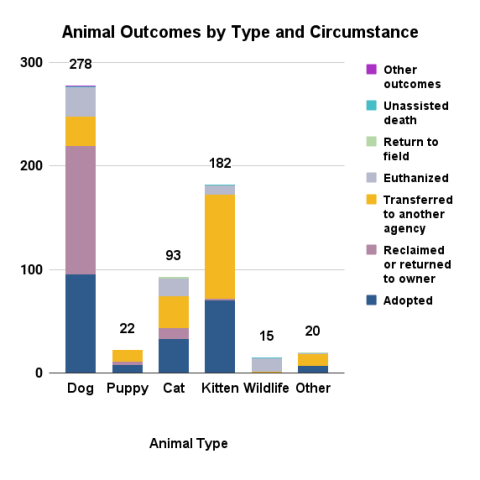 MCAS accepted stray dogs, sick, injured or at-risk adult cats and kittens from the public. Officers also picked up stray or lost animals. Owner-surrendered animals were accepted on a case by case basis, depending on urgent circumstances; adoption returns are also included in the total. Other intakes represent animals placed into protective custody by Animal Services officers, injured wildlife, or other Field-Services circumstances.