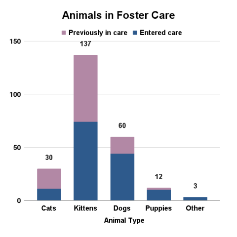 The majority of animals in foster care were kittens, dogs, cats, and puppies. Many animals entered and left foster care over the course of the month, so the total number represents the cumulative total, and not the maximum number of animals in care at one time. Thank you to 117 foster volunteers for your lifesaving service.