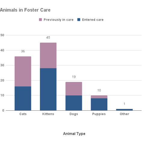 The majority of animals in foster care were kittens, cats, dogs, and puppies. Many animals entered and left foster care over the course of the month, so the total number does not represent the maximum number of animals in care at one time.