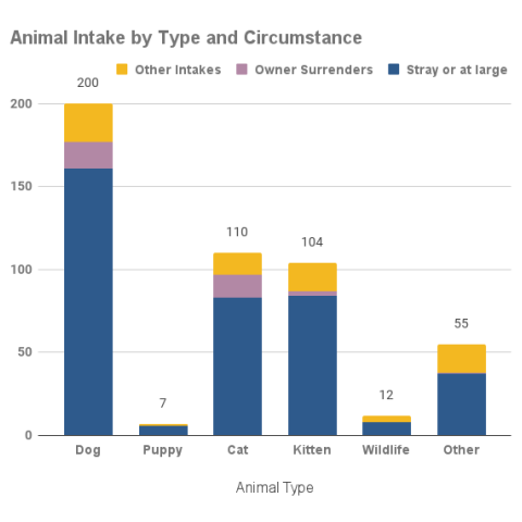 MCAS accepted stray dogs, sick or injured adult cats, kittens 6 weeks to 6 months old, and officers also picked up stray or lost animals. Owner-surrendered animals were accepted on a case by case basis, depending on urgent circumstances. Other intakes commonly represent animals placed into protective custody by Animal Services officers.