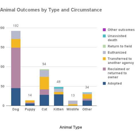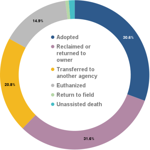 One-hundred-twenty-five animals (31.6%) were reclaimed by their owners. The majority of animals represented in these outcomes were dogs.