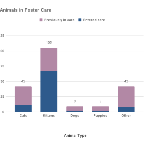 In May 2022, ninety (90) animals entered foster care, joining the existing one-hundred-seventeen (117) animals already in care at the beginning of the month. The majority of animals in foster care were kittens, adult cats, and rabbits. MCAS foster volunteers cared for a total of two-hundred-seven (207) foster animals. Eighty-three (83) of these animals left foster care for other outcomes over the course of the month, so the total number does not represent the maximum number of animals in care at one time.