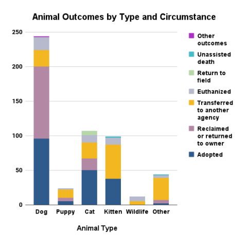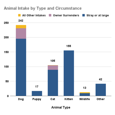 MCAS accepted stray dogs, sick, injured or at-risk adult cats and kittens from the public. Officers also picked up stray or lost animals. Owner-surrendered animals were accepted on a case by case basis, depending on urgent circumstances; adoption returns are also included in the total. Other intakes represent animals placed into protective custody by Animal Services officers, injured wildlife, or other Field-Services circumstances.