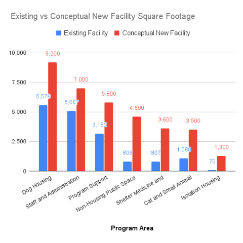 A comparison of square footage from the program areas of the current facility compared to conceptual designs for a new animal services facility