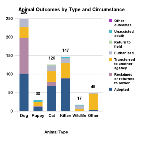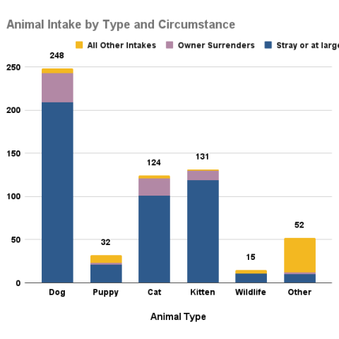 MCAS accepted stray dogs, sick, injured or at-risk adult cats and kittens from the public. Officers also picked up stray or lost animals. Owner-surrendered animals were accepted on a case by case basis, depending on urgent circumstances; adoption returns are also included in the total. Other intakes represent animals placed into emergency custody by Animal Services officers, injured wildlife, or shelter offspring.