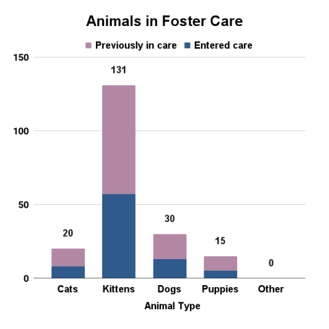 The majority of animals in foster care were kittens, dogs, cats, and puppies. Many animals entered and left foster care over the course of the month, so the total number represents the cumulative total, and not the maximum number of animals in care at one time. Thank you to 106 foster volunteers for your lifesaving service.