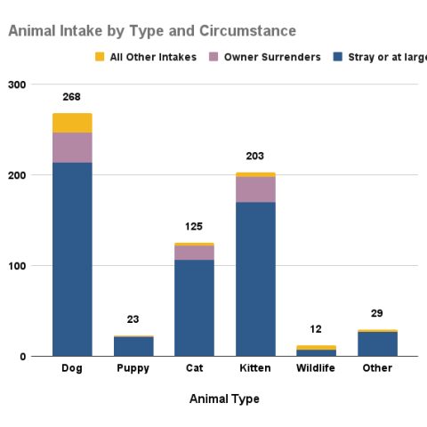 MCAS accepted stray dogs, sick, injured or at-risk adult cats and kittens from the public. Officers also picked up stray or lost animals. Owner-surrendered animals were accepted on a case by case basis, depending on urgent circumstances; adoption returns are also included in the total. Other intakes represent animals placed into emergency custody by Animal Services officers, injured wildlife, or shelter offspring.