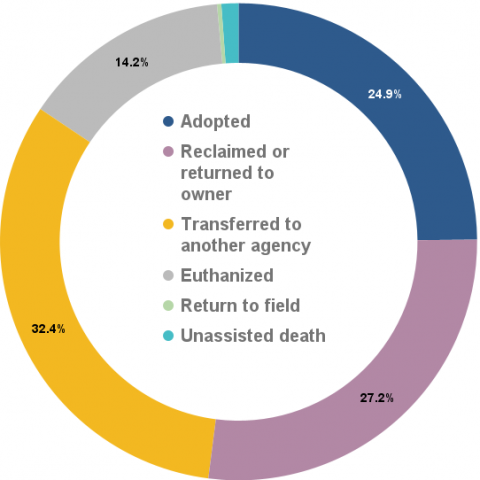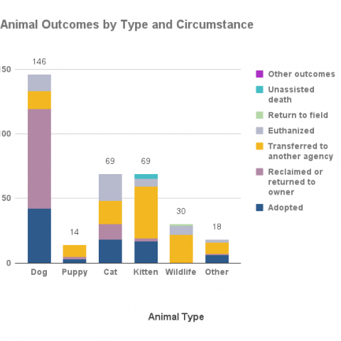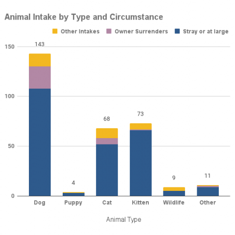 MCAS continued to accept stray pets from members of the public, and officers also picked up stray or lost animals. Owner surrendered animals were accepted on a case by case basis, depending on urgent circumstances. Other intakes most commonly represent animals placed into protective custody by Animal Services officers.