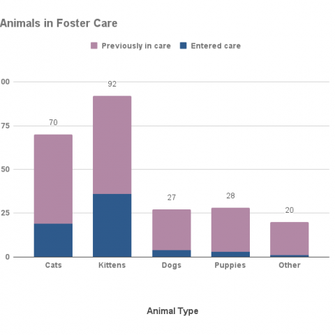 In September 2021, sixty-three (63) animals entered foster care, joining the existing one-hundred-and-seventy-four (174) animals already in care at the beginning of the month. The majority of animals in foster care were kittens, and adult cats. MCAS foster volunteers cared for a total of two-hundred-and-thirty-seven (237) foster animals. Eighty-four (84) of these animals left foster care for other outcomes over the course of the month, so the total number does not represent the maximum number of animals in care at one time.