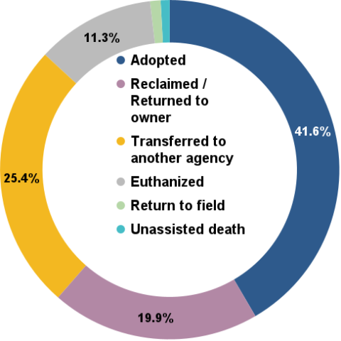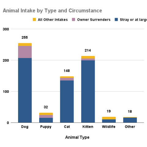 MCAS accepted stray dogs, sick, injured or at-risk adult cats and kittens from the public. Officers also picked up stray or lost animals. Owner-surrendered animals were accepted on a case by case basis, depending on urgent circumstances; adoption returns are also included in the total. Other intakes represent animals placed into protective custody by Animal Services officers, injured wildlife, or other Field-Services circumstances.