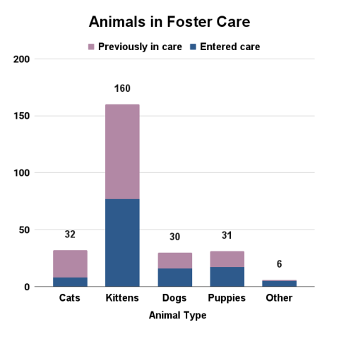 The majority of animals in foster care were kittens, cats, puppies, and dogs. Many animals entered and left foster care over the course of the month, so the total number represents the cumulative total, and not the maximum number of animals in care at one time. Thank you to 115 foster volunteers for your lifesaving service.