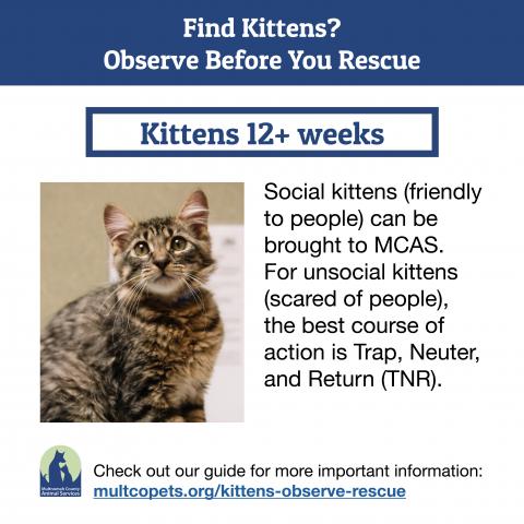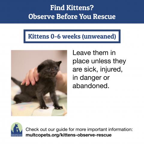 • If you are unable to care for the kittens yourself, please contact MCAS immediately for help. Call 503-988-7387.
