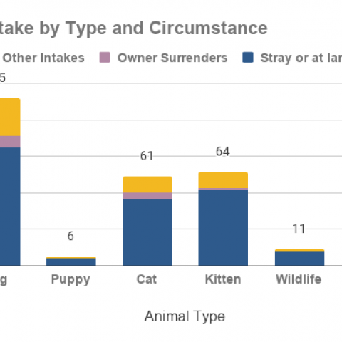 MCAS continued to accept stray pets from members of the public, and officers also picked up stray or lost animals. Owner surrendered animals were accepted on a case by case basis, depending on urgent circumstances. Other intakes most commonly represent animals placed into protective custody by Animal Services officers.