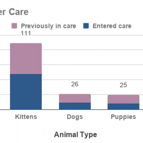 In September 2020, ninety-two (92) animals entered foster care, joining the existing one-hundred and twenty-five (125) animals already in care at the beginning of the month. The majority of animals in foster care were kittens, and adult cats. MCAS foster volunteers cared for a total of two-hundred and seventeen (217) foster animals. Many of these animals left foster care for other outcomes over the course of the month, so the total number does not represent the maximum number of animals in care at one time.