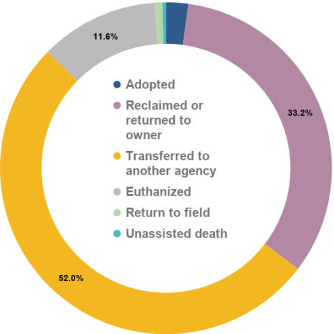 Thirty-three percent (33.2%) of animals were reclaimed by their owners. The majority of animals represented in these outcomes were dogs.