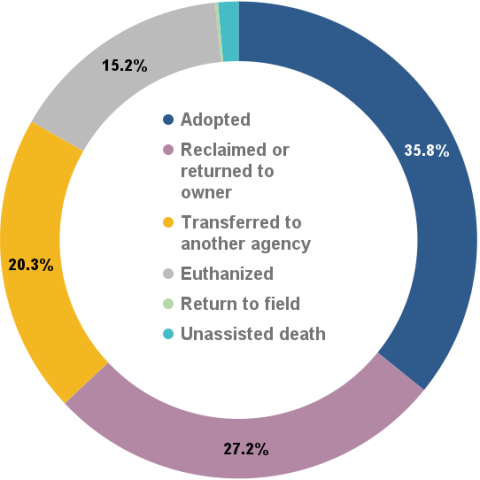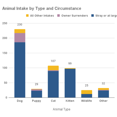 MCAS accepted stray dogs, sick or injured adult cats and kittens from the public. Officers also picked up stray or lost animals. Owner-surrendered animals were accepted on a case by case basis, depending on urgent circumstances. Other intakes commonly represent animals placed into protective custody by Animal Services officers.
