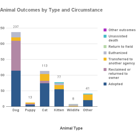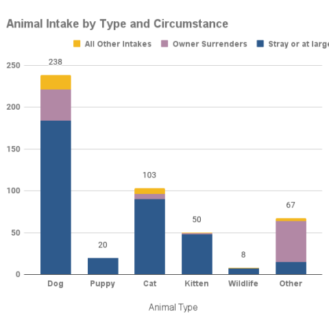 MCAS accepted stray dogs, sick, injured or at-risk adult cats and kittens from the public. Officers also picked up stray or lost animals. Owner-surrendered animals were accepted on a case by case basis, depending on urgent circumstances; adoption returns are also included in the total. Other intakes represent animals placed into protective custody by Animal Services officers, injured wildlife, or other Field-Services circumstances.