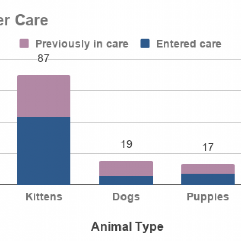 In August 2020, seventy-nine (79) animals entered foster care, joining the existing one hundred and two (102) animals already in care at the beginning of the month. The majority of animals in foster care were kittens, and adult cats. MCAS foster volunteers cared for a total of one hundred and eighty-one (181) foster animals. Many of these animals left foster care for other outcomes over the course of the month, so the total number does not represent the maximum number of animals in care at one time.