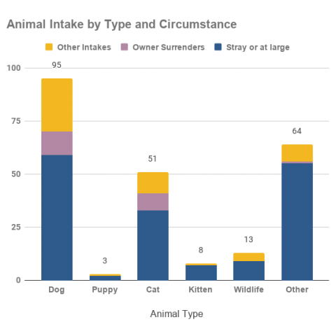 MCAS continued to accept stray pets from members of the public, and officers also picked up stray or lost animals. Owner surrendered animals were accepted on a case by case basis, depending on urgent circumstances. Other intakes most commonly represent animals placed into protective custody by Animal Services officers.