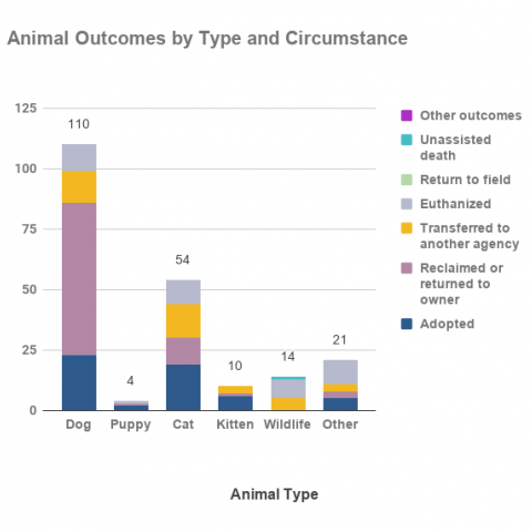 Seventy-nine animals (37.1%) were reclaimed by their owners. The majority of animals represented in these outcomes were dogs. In February 2021, fifty-five animals (25.8%) were adopted. At the end of September 2020, MCAS launched a virtual adoptions process allowing for online animal selection, application submissions, and remote adoption interviews. A low-contact process was also developed for animal pickup. Adoptions were also performed from community adoption partners, and foster homes.