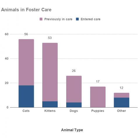In February 2021, thirty-five (35) animals entered foster care, joining the existing one-hundred-and-twenty-nine (129) animals already in care at the beginning of the month. The majority of animals in foster care were adult cats and kittens. MCAS foster volunteers cared for a total of one-hundred-and-sixty-four (164) foster animals. Many of these animals left foster care for other outcomes over the course of the month, so the total number does not represent the maximum number of animals in care at one time.